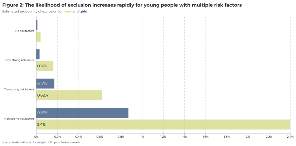 So, are we able to answer the original question about the number of young people at risk of permanent school exclusion in the UK? There is not a definitive answer to this – it depends on what we mean by “at risk”. However, based on current evidence, we would suggest that a pragmatic answer could be to focus on those children facing at least three of the strong risk factors identified by the Timpson Review.