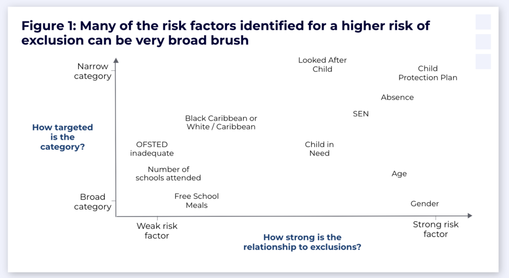 This has led Timpson and many others to highlight the need for earlier interventions to help schools support those at risk of exclusion, in order to try and improve these young people’s long-term life outcomes. But this naturally leads to the challenge of how we can identify which young people are at risk of exclusion and quantify them.