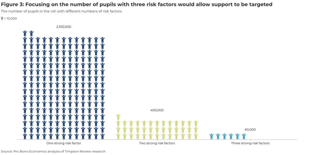 If this data is representative of the broader picture across the UK, this means that across England the number of pupils with one strong risk factor is likely to be 2.1mn, the number with two risk factors could be around 400,000 and the number with three risk factors is likely to be around 60,000.